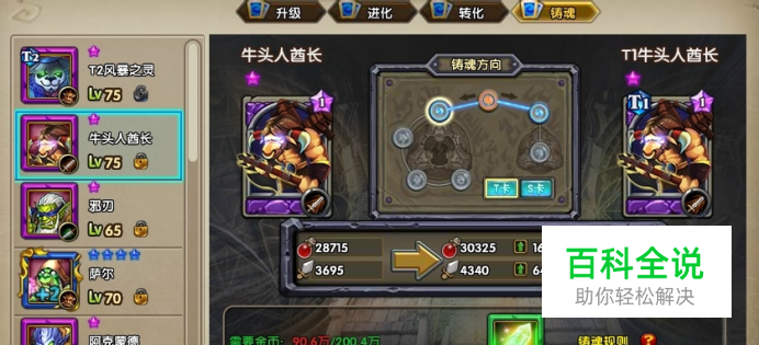 8090热血魔兽玩家经常看到有很多英雄卡牌前面带有t或者s字样,属性比起普通卡牌也会高出很多,这个实际上就是铸魂系统的功劳了。热血魔兽铸魂系统可以将卡牌升级为s或者t系列,那么下面介绍8090热血魔兽多少级开启铸魂以及铸魂系统有什么作用。 首先,玩家需要达到50级才能开启铸魂系统,低于50级是无法打开界面的。铸魂可以自己选择铸魂方向,分为t卡和s卡。t卡代表了副本方向,主要偏重于打副本,s卡代表pvp方向,主要是竞技场和全服战场。至于选择t卡还是s卡这个就根据各位玩家自己的偏好来决定了。 升级t卡需要消耗t1碎片,升级s卡则需要消耗荣誉。t1碎片可以在试炼之塔的第五层打到,荣誉则是竞技场以及强者领域那里获取。升级t卡主要提升卡牌的攻击和防御,升级s卡主要提升卡牌的韧性和暴击,两者的偏重是不一样的。t系列卡牌有4个等级,t1-t4,而s系列卡牌是2个等级,从s1-s2。 热血魔兽的铸魂系统就介绍到这里,各位玩家根据自身需要来选择升级t系列还是s系列。