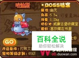 属性:幽灵 身高:5.7m 体重:1.2kg 栖息地:威廉古堡收藏室 爱好:喜欢藏在书里 简介:蠢货,今天让你见识一下知识的力量,不懂得学习的你,只会当作做我的手下败将。 开启条件:打败艾若拉 宠物等级达到:65级