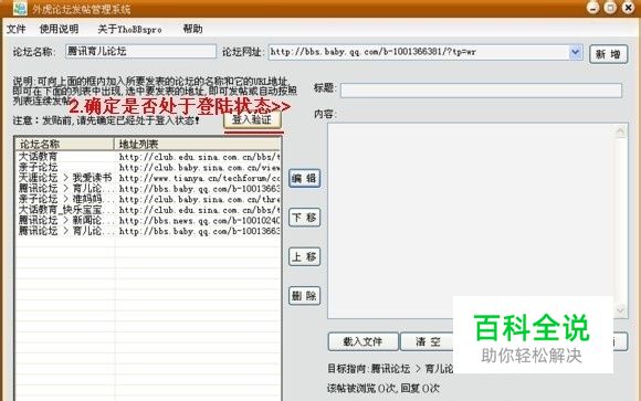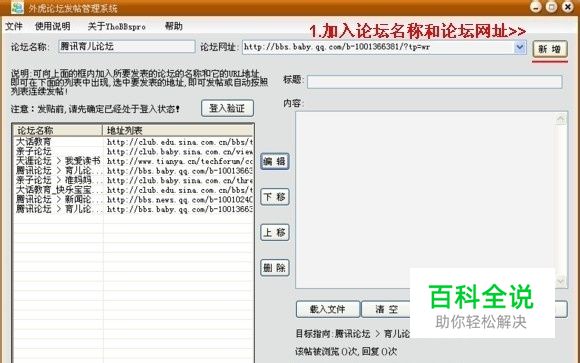 外虎论坛发帖管理系统YhoBBspro使用教程:(请确保当前您电脑的操作系统是否符合软件所适用的操作系统,以及是否正常安装。电脑中毒或网页工作不正常都会影响软件的使用效果!)首先开启发帖系统,加入你要发帖的论坛名称和它所对应的论坛网址。点击新增按钮,随后它就会出现在左边的列表框中。以上列表框中出现的是一些常见可支持的论坛实例。注意:本发帖管理系统不支持所有的论坛!接下来这个很重要,也就是每个总论坛,你必须得预先让它处于登陆状态!这个可以到网页上面登陆即可。 然后就是写入论坛发帖主题和所要发帖的内容了。也可预先写好文本载入。最后就是启动自动发帖程序,这时候发帖系统就会按照左边地址列表框中的论坛地址,从上到下顺序发帖了。这可在右边下方的界面上看到所发表帖子的被浏览和被回复的具体情况。