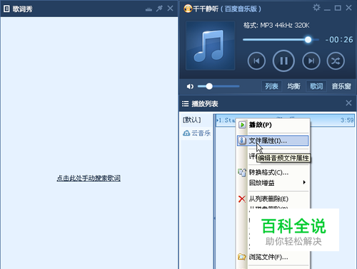 在列表上右键需要添加歌词的MP3,选择“文件属性”。