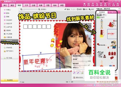 接着到“饰品”菜单下,在“缤纷节日”分类下找到新年素材,选中自己喜欢的素材并添加进图片中。