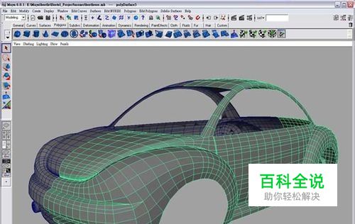 选择想要使用的材质。车子的制作如图,首先得调整好车子的形状。车子完成之后,制作一个车子的物体,放在车子里挡住空白的地方,如图线框图。用POLYGON的CUBE堆出如图,当作背景。