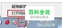 用鼠标右键或者左键点击Win7桌面右下角的“网络连接标志”图标,选择“打开网络和共享中心”。