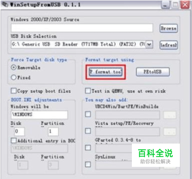 U盘安装XP方法: 第一步,安装WinSetupFromUSB,安装完后,运行桌面上的WinSetupFromUSB快 捷方式, 打开WinSetupFromUSB程序窗口, 首先对U盘进行格式化, 点击HP format tool(P format too)按钮,如图: