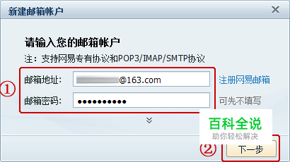 新建邮箱帐户时,输入 邮箱地址、邮箱密码 ,点击 下一步,如下图所示: