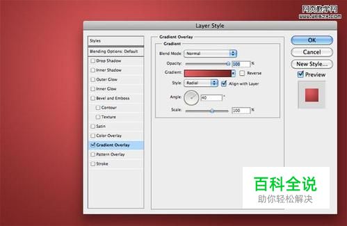 第二步:创建一个径向渐变 现在我们新建一个图层,然后选择混合模式为渐变叠加,样式为“径向”,颜色从淡红色(#e45f5f)去一个暗红色(#7a2424)。
