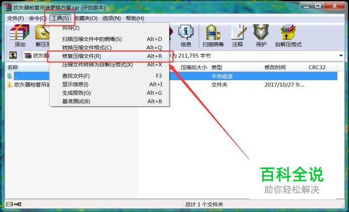 首先,请大家使用Winrar软件打开出现错误信息提示的压缩文件,然后点击“工具-修复压缩文件”选项。