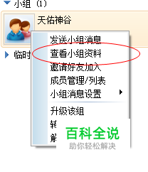 然后在小组选项卡界面,右键单击小组并选择查看小组资料的选项,如图: