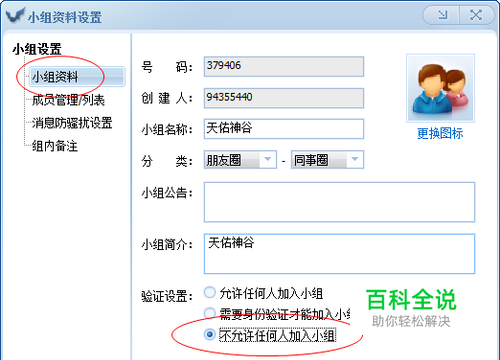 然后在左侧的小组资料选项卡中勾选右侧的不允许任何人加入小组的选项,最后点击右下角的确定按钮,如图所示: