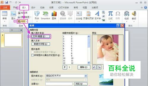 首先我们借用Powerpoint丰富的动画动态效果制作一个ppt相册。把照片插入Powerpoint中,插入方法:点击“插入”→“相册”,再从“文件/磁盘”选择我们准备好的照片并全部创建到Powerpoint里面。
