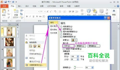 我们可以从网上下载一个漂亮的ppt模版作为相册的背景,有静态和动态的。把下载的宝宝相册模板插入ppt中,右键单击幻灯片空白处,选择“设置背景格式”→“填充”→“图片或纹理填充”,当然如果懒得下载ppt模版,可以直接使用Powerpoint里面的纯色或纹理填充。