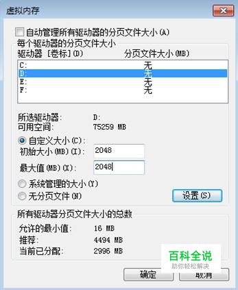 在上图中的驱动器盘符中选一个空闲空间大的,比如说D盘,点一下,这个驱动器会变成蓝色的,在点一下中间的“自定义大小”,再初始大小和最大值框内输入合适的数值,一般根据你物理内存的大小,最大值和物理内存一样大,初始大小可以和最大值一样,也可以是一半,最后点一下旁边的设置