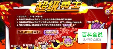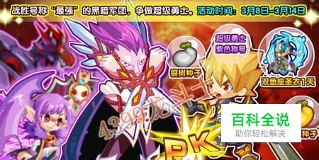 活动时间:3月8日-3月14日 活动奖励:银树种子、金树种子、双鱼座圣衣、超级勇士紫色称号 龙斗士黑暗军团居然声称自己是阿斯兰世界的最强军团!呔!脸皮何在~ 黑暗军团沉寂了两个礼拜之后,3月8日卷土重来,想要破坏绿化!是时候给黑暗军团松松筋骨了! 战胜低级的黑暗成员后就可以继续向高级的黑暗成员发起挑战!战胜黑暗军团的成员就可以获得相对应的奖励!每天有10次挑战机会! 战胜5次黑暗大将怀斯曼以后还可以获得特级称号【超级勇士】! 每个黑暗成员的挑战类型是随机的,但是如果要更换的话就要花费5龙币了!【纳豆建议还是不要!】 最后,大家来看看超级勇士的相对应奖励吧!