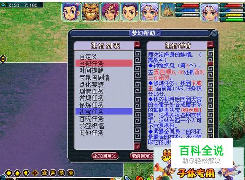 自定义任务栏:想必大家身上都有一些任务吧?比如不怎么想过的剧情,法宝等。但是每天师门抓鬼等任务的时候经常会被那些任务给挡着看从而不到自己想完成的任务,需要每次下拉任务栏才能看到很麻烦。