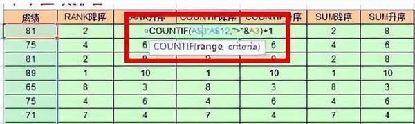 3、在图示的案例中,我们对成绩进行排名,同样在图示第一个单元格输入COUNTIF公式:=COUNTIF(A$3:A$12,">"&A3) 1,然后向下拖拉公式即可。