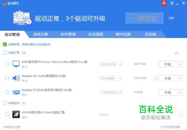 软件自动扫描,扫描完成后提示有需要更新的驱动,直接点击升级就可以了,或者为了防止杀毒软件拦截,点开下拉菜单,选择强制安装即可。