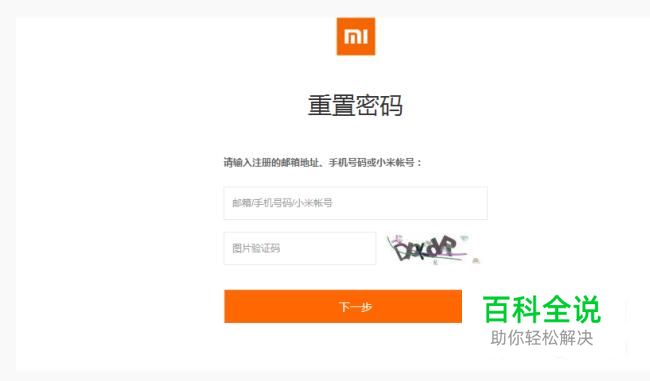 进入重置密码的界面,第一栏输入注册的邮箱地址、手机号码或小米帐号,第二栏输入图片验证码,然后进入下一步。