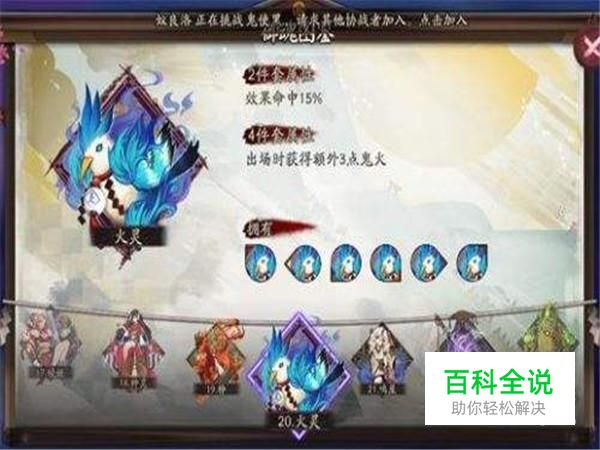 在游戏中,装配数量不同的同一御魂可以提升效果,火灵御魂2件套属性:效果命中30%,4件套属性:出场时获得额外3点鬼火。