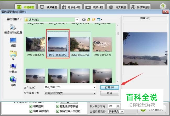 打开相册所在文件夹,选中添加照片,可以按住Ctrl键并点击选中多张照片,再点击“打开”。