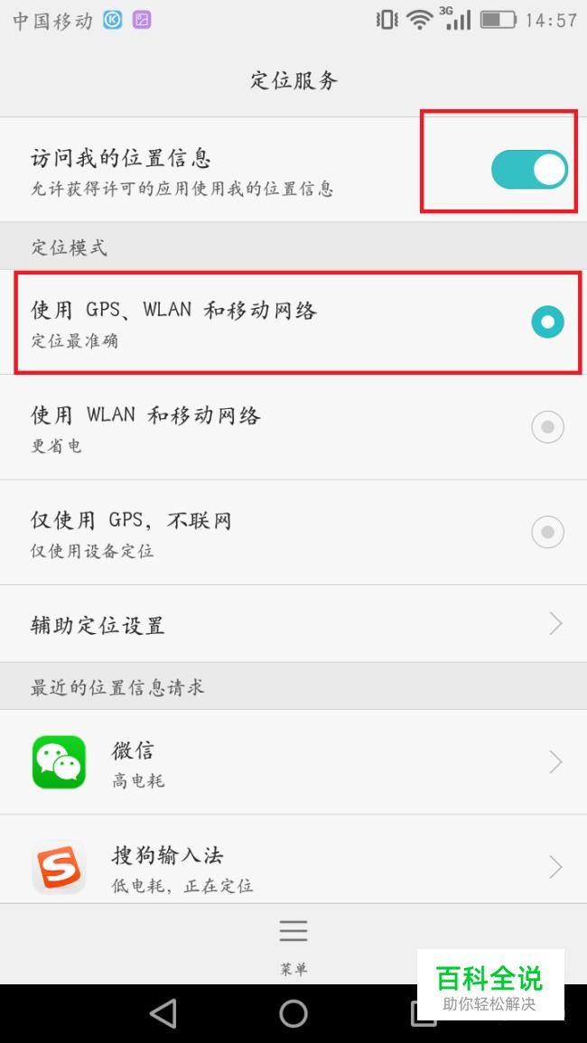 在进入的新界面,打开允许访问我的位置信息,在定位模式里,选择第一个,因为这个定位最准确。