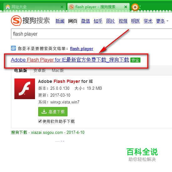 接着我们用浏览器搜索flash player ,然后下载安装好之后重新启动浏览器。