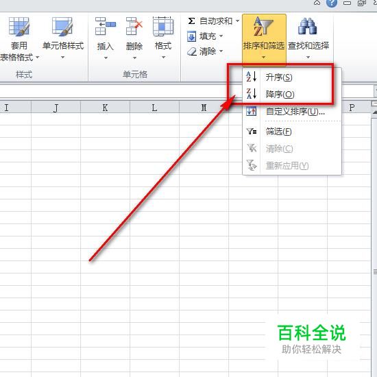 接着来到开始菜单下的“排序和筛选”,“升序”和“降序”就是对数据进行排序的。