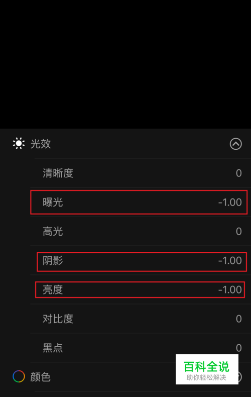 分别点击曝光、阴影、亮度,都往左移,移到最底即可,这样这张图片就变成黑色的了,再点击关闭就完成了。