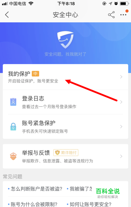 然后,会进入 安全中心 ,在此页面点击 我的保护 。