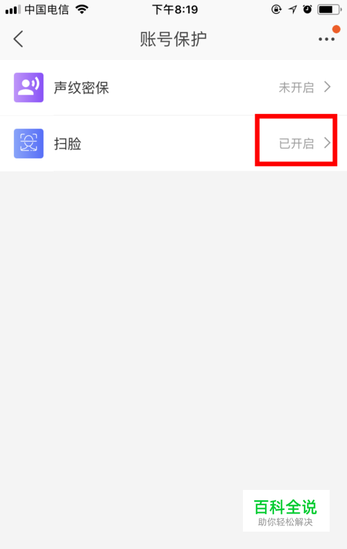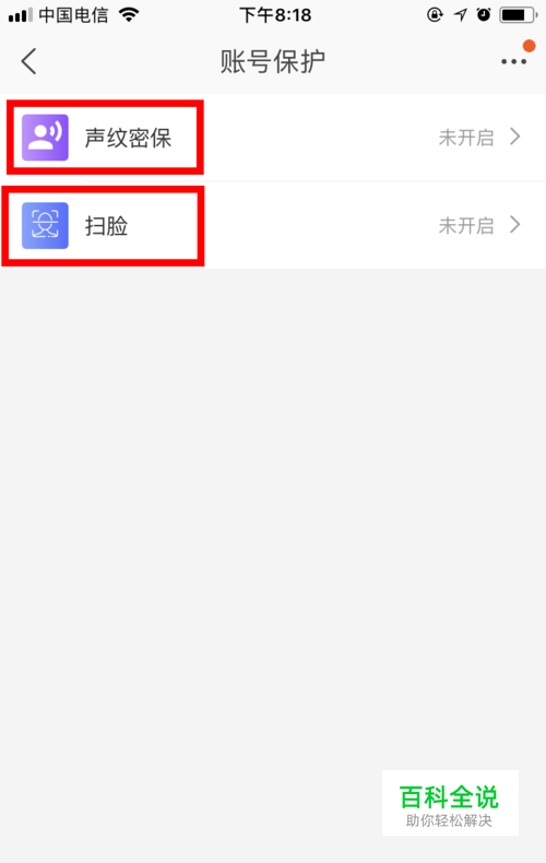 账号保护有两种方式,一种是 声纹密保 ,一种是 扫脸 。我们今天分享的是 扫脸 功能,因此要点击 扫脸 。