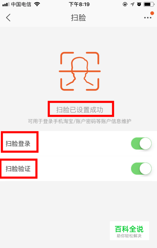 OK,扫脸已设置成功。登录以及身份验证都需要进行扫脸,当然,也可以根据自身的要求关闭其中一项功能。关闭时,只需滑动该项功能后面的开启按钮即可。