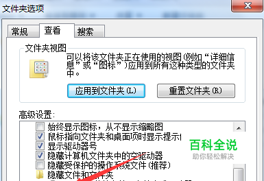 在选项里边找到下边这个,显示所有隐藏文件和文件夹。只有把这些都显示出来。我们才知道哪些是我们需要删除 的。