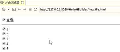 功能描述: 1、勾选全选按钮时,下面1-5复选框全部选中; 2、取消勾选全选按钮时,下面1-5复选框全部取消选中 3、依次勾选1-5复选框时,全选按钮自动勾选 4、1-5复选框中有一个被取消勾选时,取消勾选全选按钮