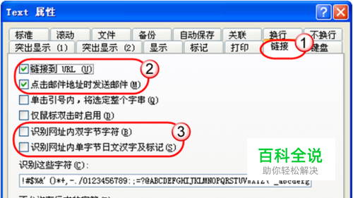 接下来,我们选择“链接”选项卡,在其下选中“链接到URL”前面的复选框,如果还希望在文本编辑器中点击邮件地址就能发邮件,则选中“点击邮件地址时发送邮件”选项。请注意,有些网址中可能含有中文字符或单字节的日文符号或标记,如果想让这类网址也发挥作用,那么需要同时选中“识别网址内双字节字符”和“识别网址内单字节日文汉字及标记”选项。选好之后确定(如图2)。