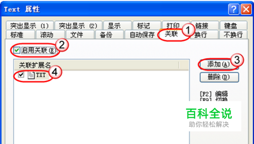因为我们的TXT默认是与记事本程序关联的,所以首先需要安装EmEditor软件,并建立与TXT文件的关联。如果你选择的是自动安装,则这种关联是自动建立的,不需要人为干预。但如果你使用的是绿色版的EmEditor,就需要手动建立关联,方法是,点击EmEditor窗口命令“工具→当前配置属性”(或按快捷键Ctrl+Enter),在属性窗口中点击“关联”选项卡,然后选中“启用关联”复选框,接着点击“添加”按钮,并在出现的关联扩展名文本框中输入TXT且选中其前面的复选框,确定即可(如图1)。