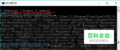 打开cmd窗口,输入命令“set | findstr /I android”,可以得到如图所示的结果,从这个结果中可以找到Android sdk安装的路径。