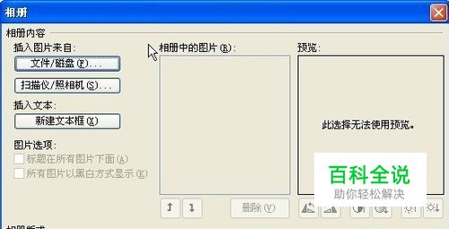 弹出“相册”对话框,单击“文件/磁盘”按钮选择磁盘中已有的图片文件,单击“插入”按钮