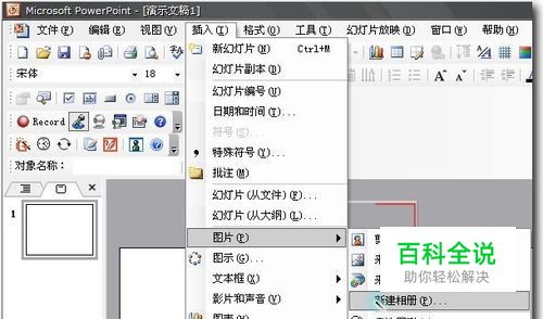 启动PowerPoint软件,新建一个空白版式的演示文稿。依次单击“插入”菜单→“图片”→“新建相册”命令。