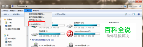 在打开页面上方,找到“工具”,单击,出现一个下拉菜单,选择“文件夹选项”。