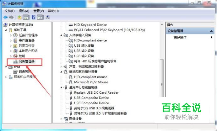设备管理器 在弹出的【计算机管理】窗口中,点击【设备管理器】,如下图所示: