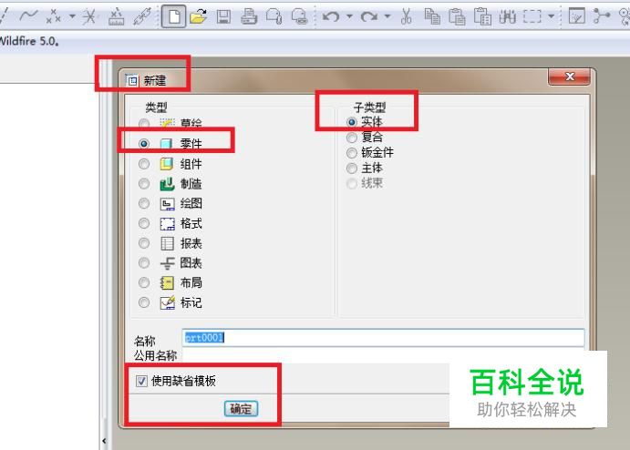 如下图所示, 打开Pro/e5.0软件, 新建一个实体零件文件, 默认使用缺省模板, 点击“新建”对话框下方的“确定”就可以了。