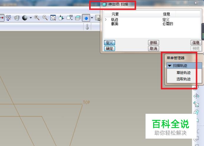 如下图所示, 软件右边弹出一个“伸出项:扫描”对话框, 同时出现的还有一个菜单管理器, 这里我们要做到是点击“菜单管理器”中的“草绘轨迹”。