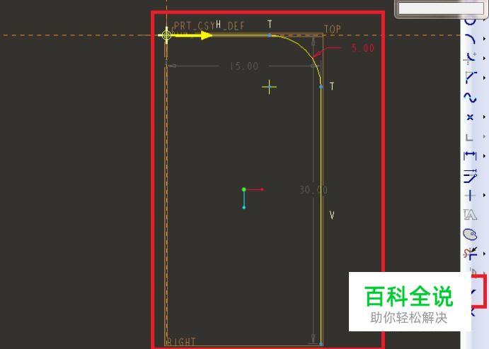 如下图所示, 正式进入到草绘状态, 点击右边的工具箱中的“直线”命令, 画一条水平线和一条竖直线, 再点击右边的工具箱中的“倒圆角”命令给这一横一竖两条直线倒个圆角, 之后再双击图中的尺寸,进行尺寸的修改, 具体尺寸可以参照下图, 最后点击右边工具箱中最下边的√, 完成轨迹的草绘。