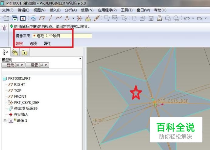 如下图所示, 见软件左上角的信息提示部分, 要求我们选择“镜像平面”, 看红色五角星所在的那个发光的平面, 那就是我们选择的平面。