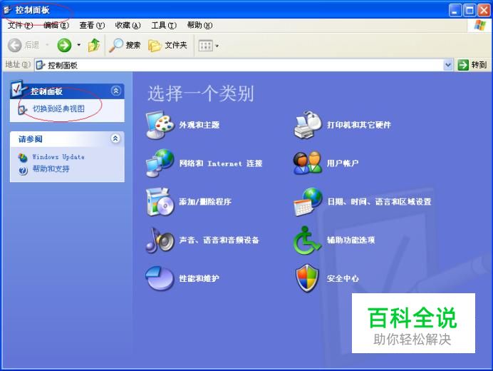 如图所示,唤出"控制面板"程序窗口。点击左侧"切换到经典视图"图标,用于显示控制面板所有项目。