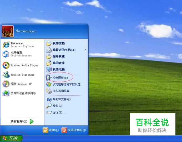 启动Windows XP操作系统,如图所示。点击任务栏"开始"按钮,弹出开始菜单选择"控制面板"项。