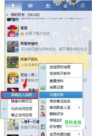 如果想屏蔽对方消息,找到你想设置的好友,在该好友头像上点击鼠标右键,弹出的菜单中选择:设置权限->屏蔽此人消息
