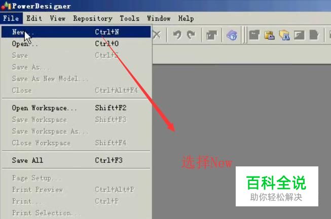 首先打开PowerDesign软件,点击顶部的File菜单,选择下拉菜单的New选项,如下图所示