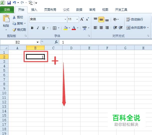 之后我们选中该单元格,然后我们将鼠标放在该单元格的右下角,出现十字符号后,我们进行下拉;