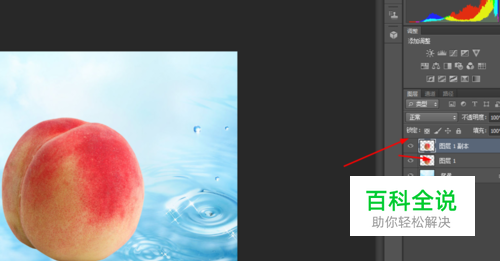 在ps软件中,新建一个800*800的文档,打开一张水的图片作为背景,再打开一张桃子的图片,并按ctrl+J复制一个出来,如图所示