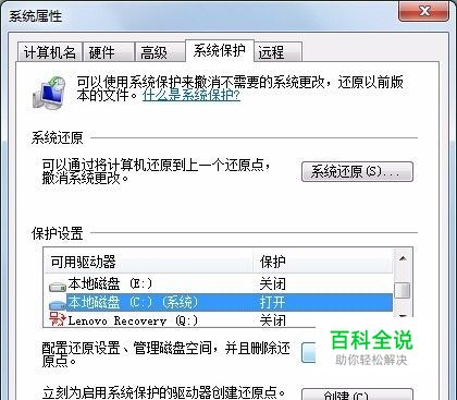 然后弹出“系统属性”窗口,在“保护设置”那里找到系统所在的硬盘——C盘,单击选中,然后点击下方的“配置”